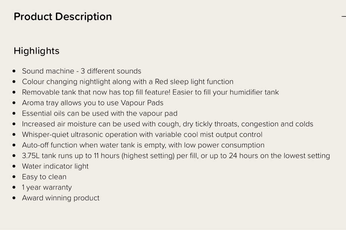 It works perfectly and has different sounds: white noise, rain and ocean, several cool mist settings, a red sleep support light and Vapor pads for aroma therapy.