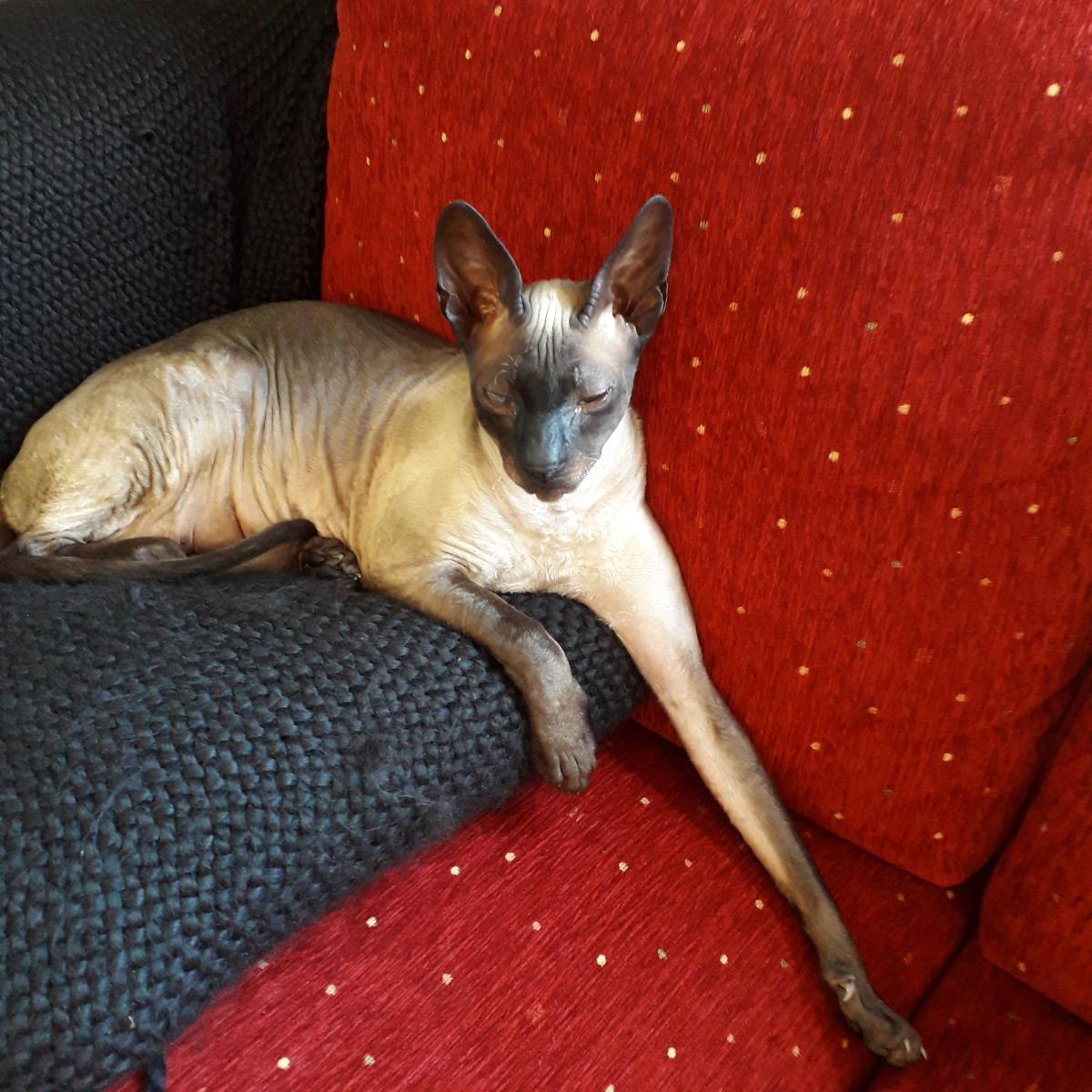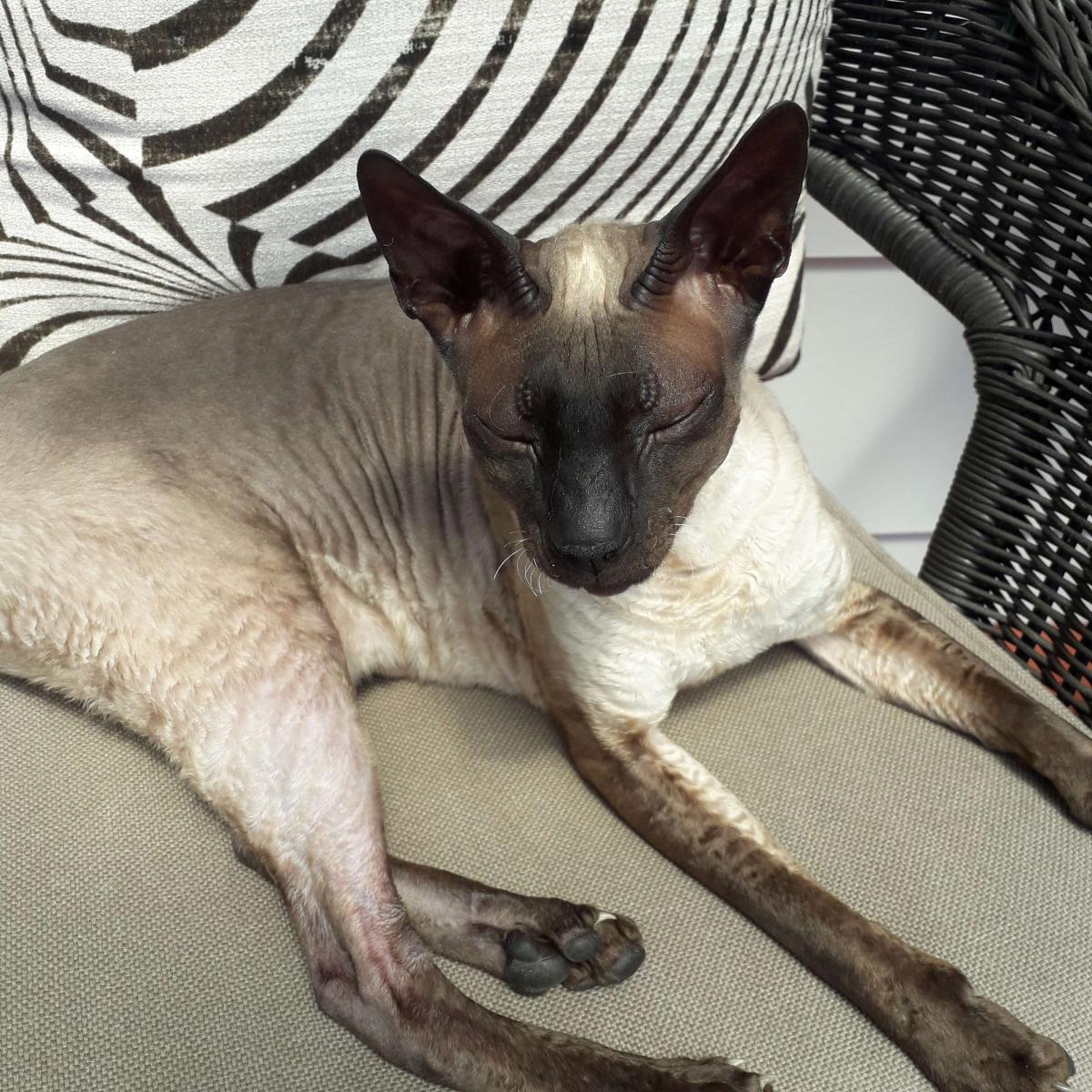 Seal Point Cornish Rex Looks similar to Siamese. Large upright ears, Blue eyes, Short wavy fur, long tail, long slim build. Distinctive Siamese type meow.