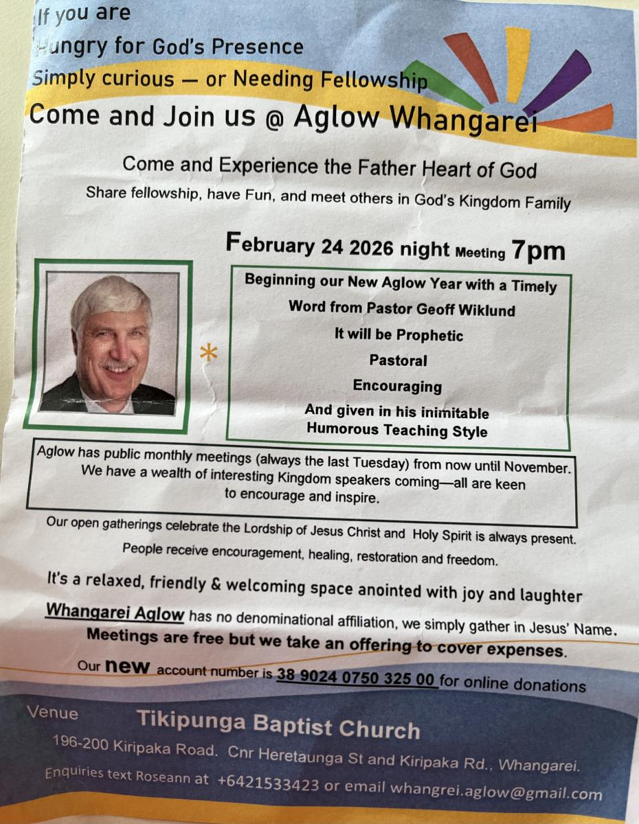 Please join us for an inspiring massage from Pastor Geoff Wiklund, 7 pm Tikipunga Baptist Church, 25th of February!
