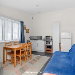 Three good-sized bedrooms include a master complete with a lavish bathtub and walk-in wardrobe, while a family bathroom serves the remaining rooms. Attached to the side of the main house is a 42 square meter self-contained flat, ideal for guests or generating additional income.