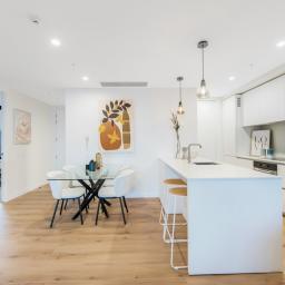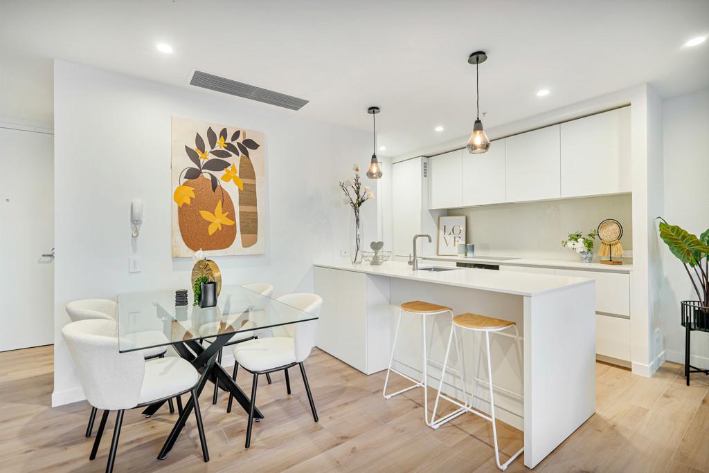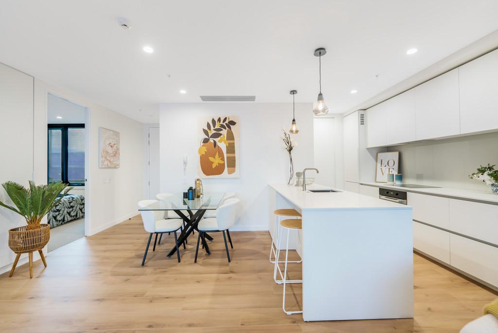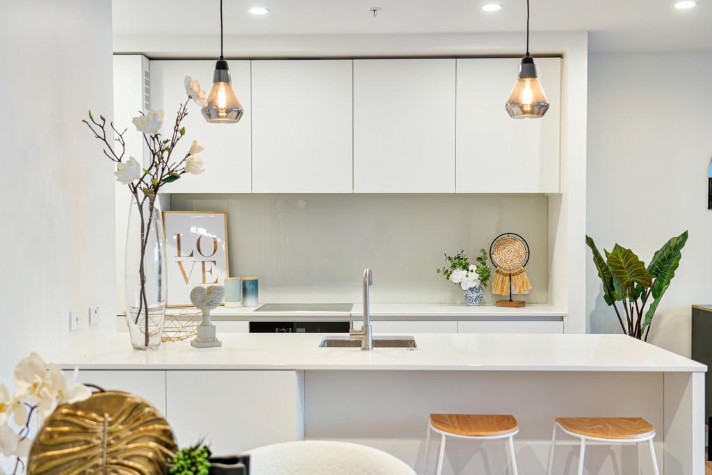 Staged show apartments are available for viewing through weekend open homes or contact Casey to arrange a private viewing. Photos are taken from an apartment of the same floor plan with white kitchen.