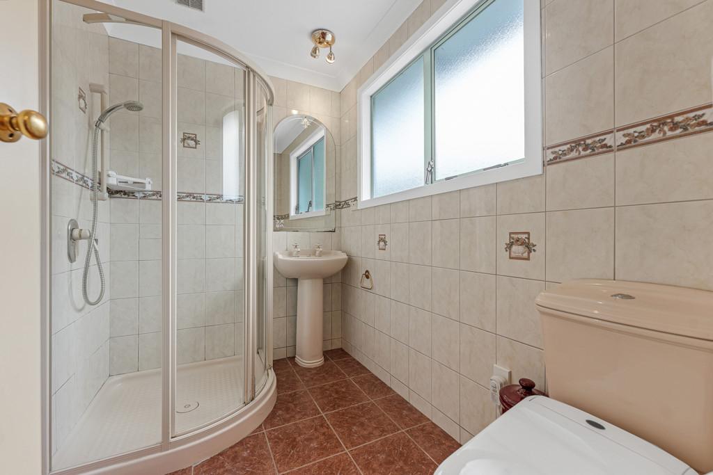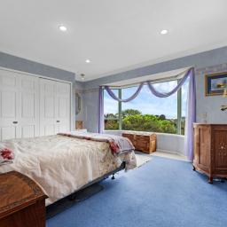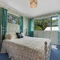 The main bedroom draws the eye to its expansive bay window, presenting bushland and water as an intimate panorama, while a stained-glass door adds an artisan touch to the home's rich history.