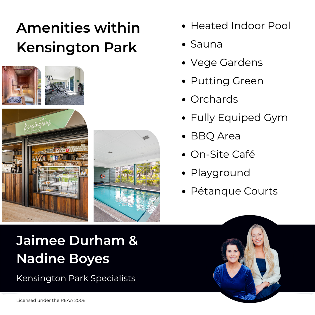 As a Kensington Park resident, you'll have access to premium facilities including a heated indoor pool, gym, sauna, community gardens, walking trails under ancient puriri trees, and a scenic lake. There's even an on-site café open five days a week - ideal for a coffee after your private viewing and tour.
