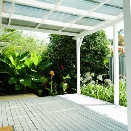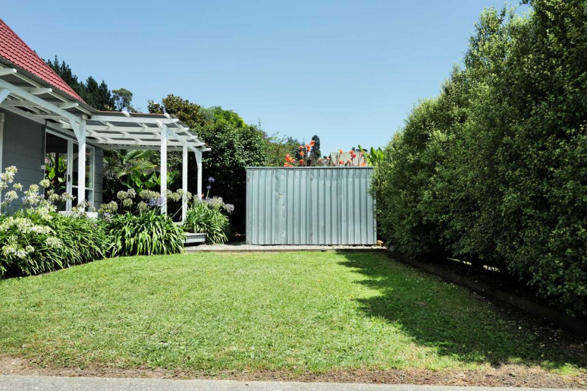 Easy-care tropical landscaping and a garden shed for extra storage.