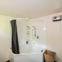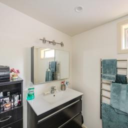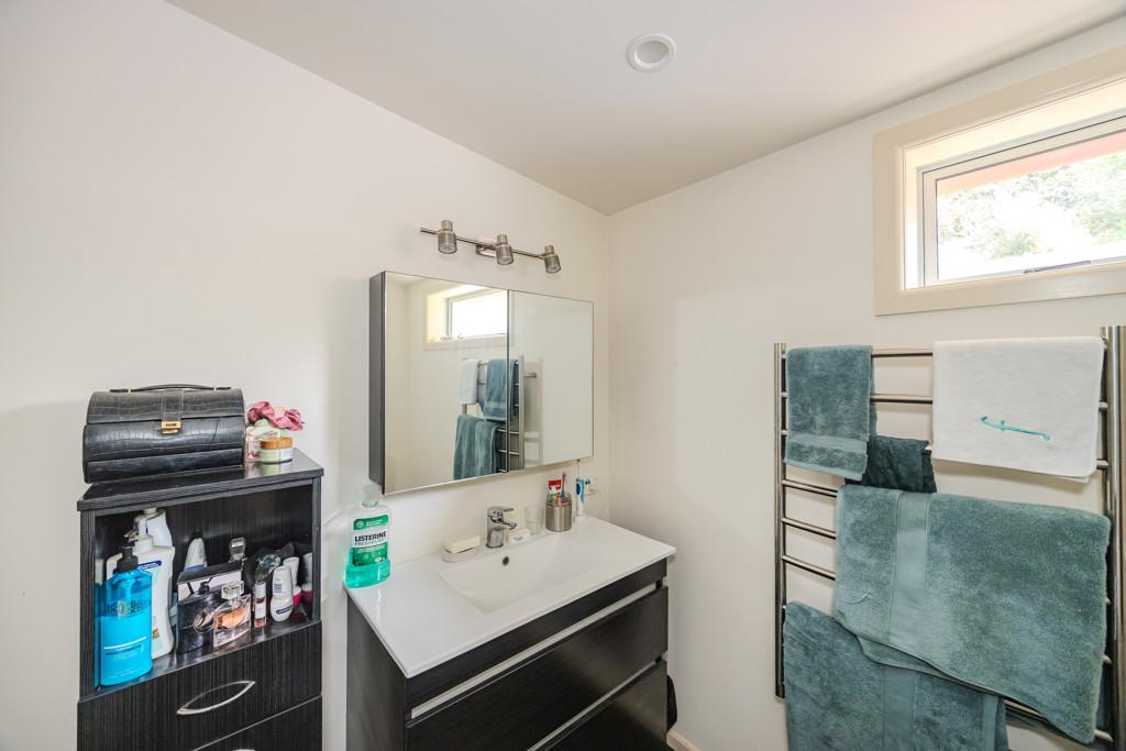 The adjacent modern home offers a spacious two-bedroom layout, complete with a large bathroom, kitchen, and separate laundry room.