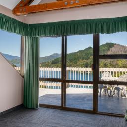 The home truly shines on the top floor, with an open-plan kitchen and lounge flowing onto an expansive deck. A wood burner keeps the space warm in cooler months while floor-to-ceiling sliding doors frame the spectacular scenery.