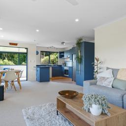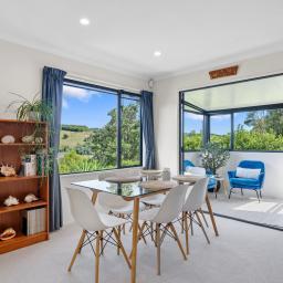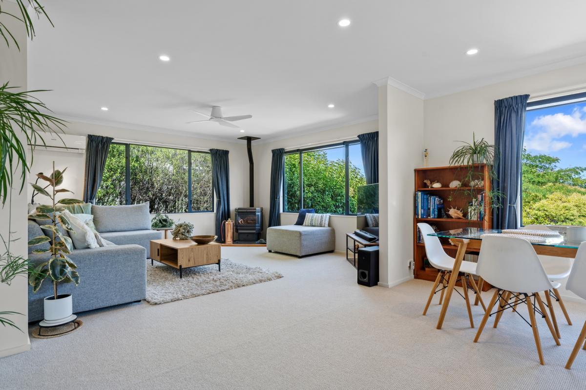 • Open plan dining and living with pellet burner, ceiling fan and a A/C unit for summer and winter