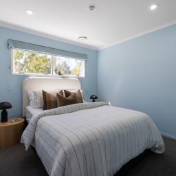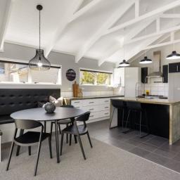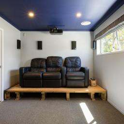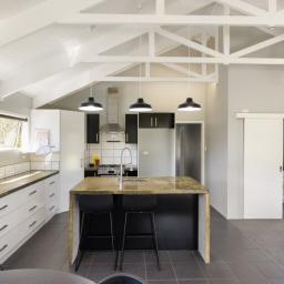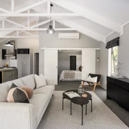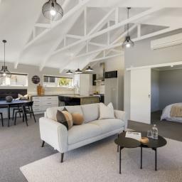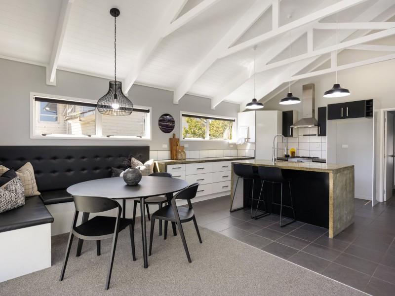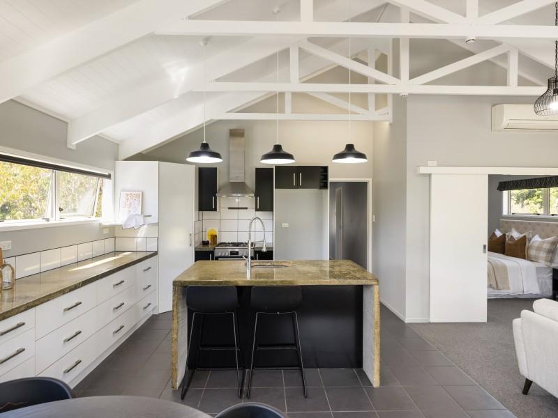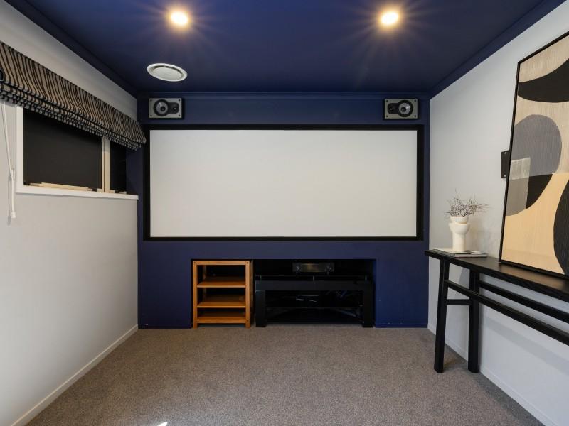 Inside, the open-plan kitchen, dining, and living area create a seamless space to gather and entertain. The funky concrete benchtop and island add a modern industrial touch, while the high ceilings and exposed beams bring warmth and character. Movie nights just got better with a dedicated media room, complete with a TV and speakers, all included in the sale.