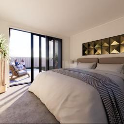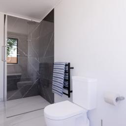 The master bedroom is a true retreat, with a thoughtfully designed walk-in wardrobe, a well-lit layout enhanced by a strategically placed window, and direct access to the sun-drenched patio. Its ensuite includes a spacious tiled shower with a rainfall showerhead for ultimate relaxation.