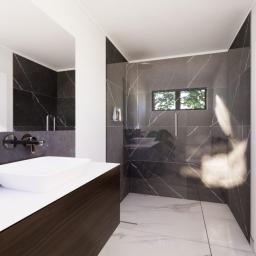 The main bathroom exudes luxury, featuring a freestanding Verona bath with a tiled surround, underfloor heating, frameless tiled showers with 10mm glass, and premium European fittings. The double garage offers ample space for two vehicles, complete with a built-in stone-top laundry and a Thermador-insulated garage door.