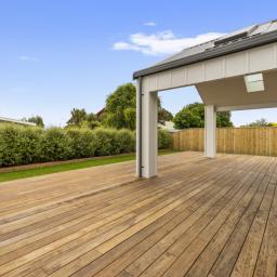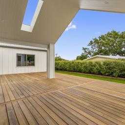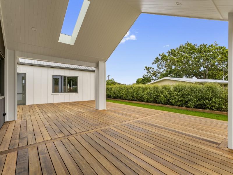 At the centre of the home is a designer kitchen with stone benchtops, a walk-in scullery complete with sink and power points, Bosch oven with Home Connect functionality, wine cooler, and a sliding server window. The open-plan kitchen, dining, and family room is light-filled and connects directly to the west-facing Kwila hardwood deck, partially covered to extend its use through the seasons. A separate living room provides a quiet retreat away from the main living zone.