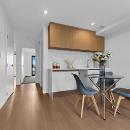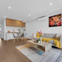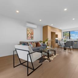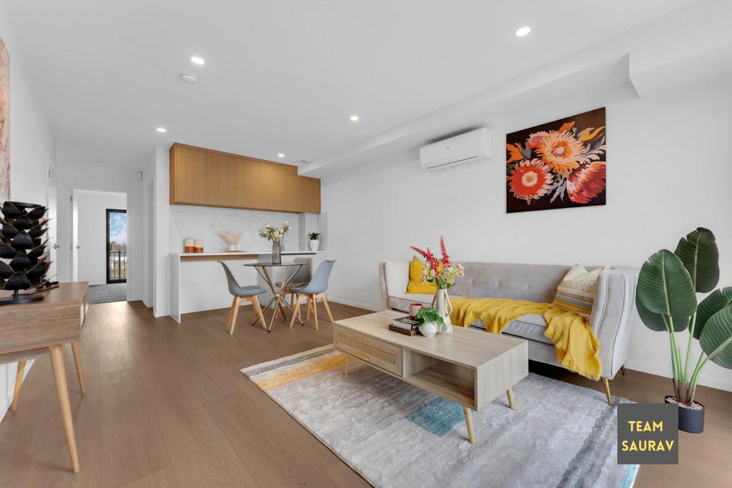 Step inside to a warm and inviting interior featuring a combined lounge and dining area that flows seamlessly into a sleek, contemporary kitchen. The kitchen is equipped with high-quality appliances including an electric cooktop, wall oven, and dishwasher.