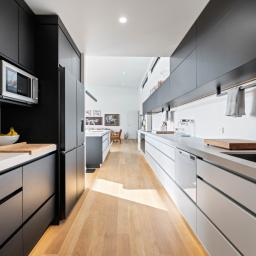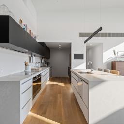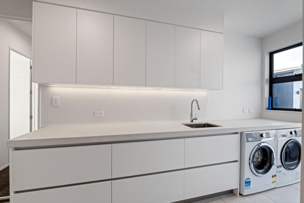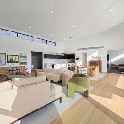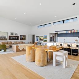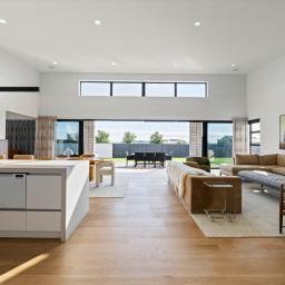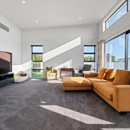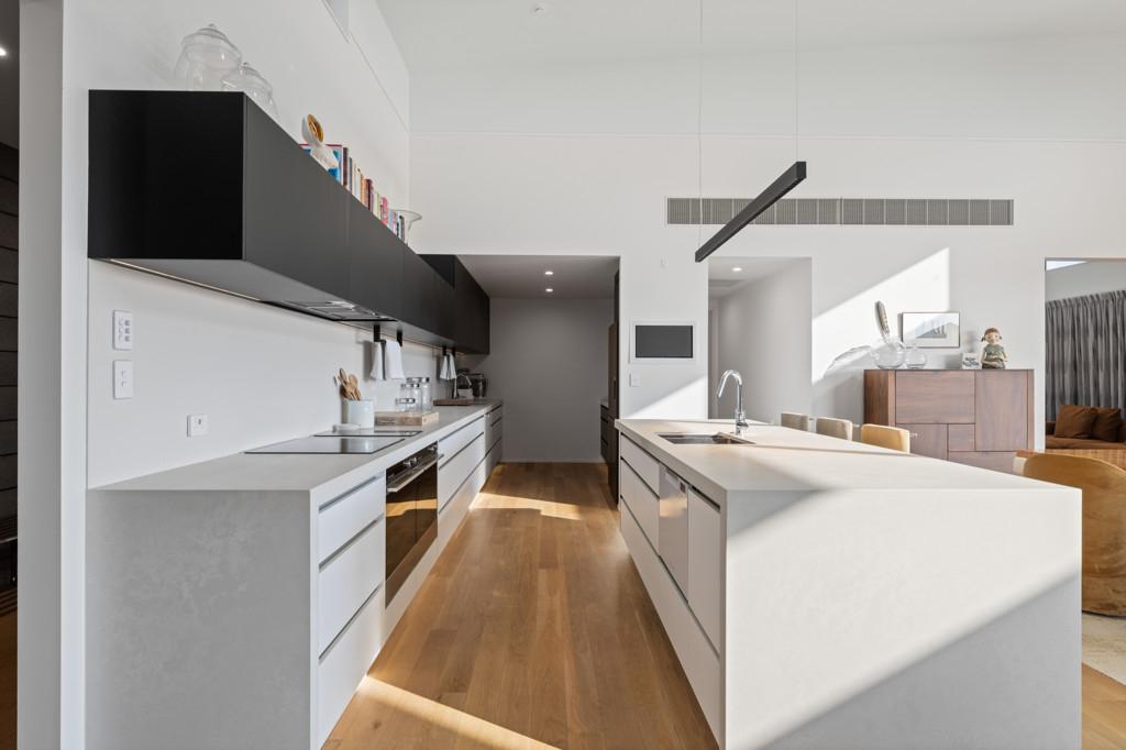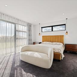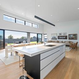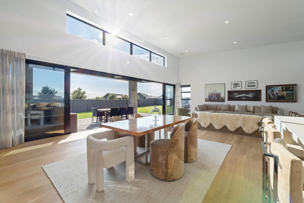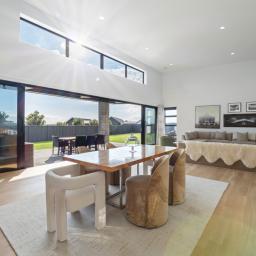 At the heart of the home is a stunning kitchen, beautifully designed with a scullery, high-quality appliances, and a striking manufactured stone benchtop. It flows effortlessly into a supersized dining and family area, all bathed in natural light and finished with exquisite American white oak flooring.