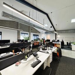 The space features an industrial aesthetic with exposed brickwork, high ceilings, a pitched roof, and polished concrete floors, complemented by a practical and flexible layout designed to suit a range of professional uses.