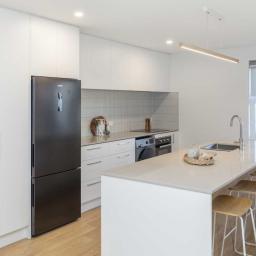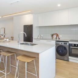 Open plan kitchen and living area with heat pump. Plenty of kitchen space with large island bench, Oven, induction hob with extractor fan, Fridge, Dishwasher, and Washer Dryer.