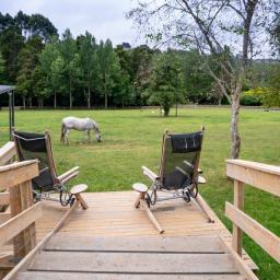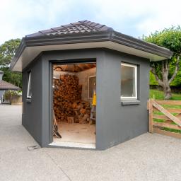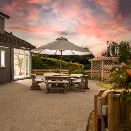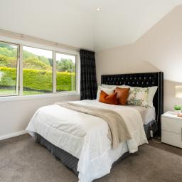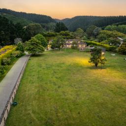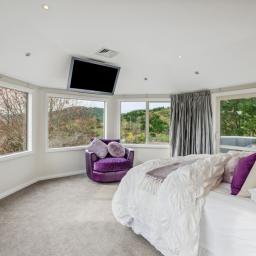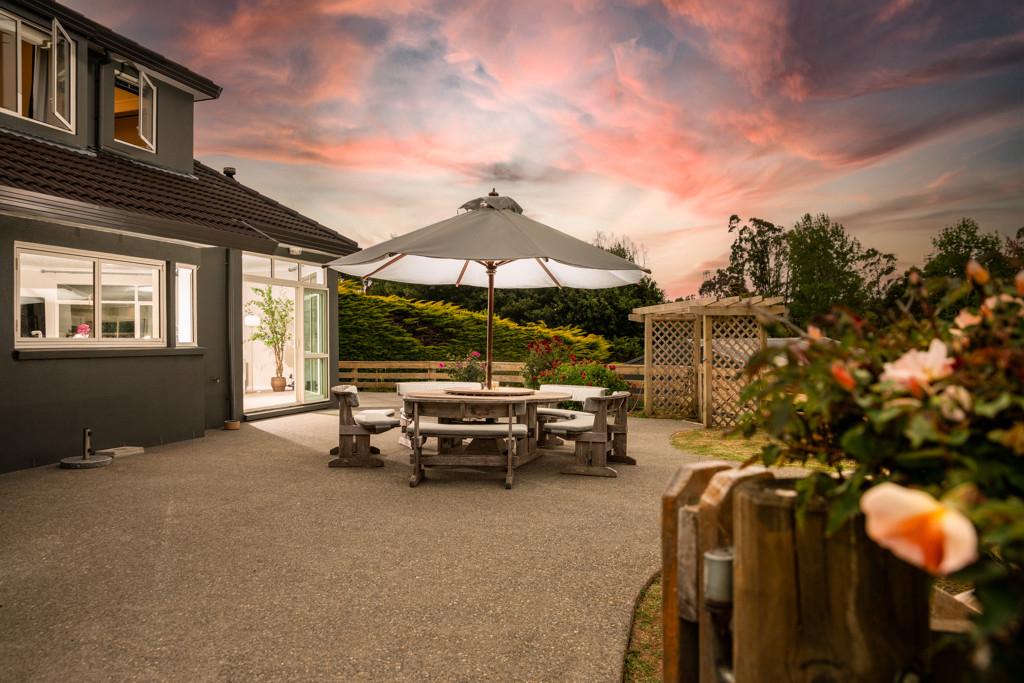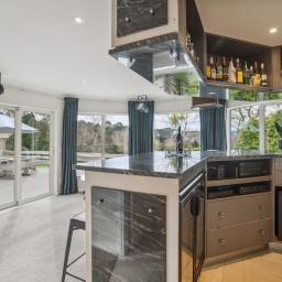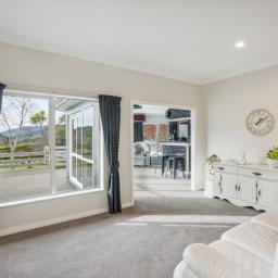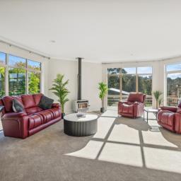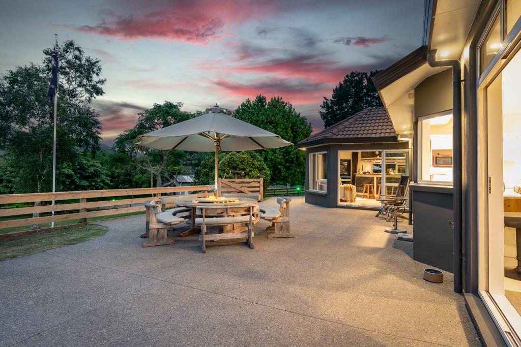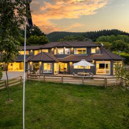 Large, double-glazed windows frame the landscape with symmetry, ensuring warmth and sunlight through every season, while gas fires, wood burners, and heat pumps ensure comfort is never in question. The sliding doors allow effortless flow to terraced courtyards, and quiet corners designed for alfresco dining and long summer evenings, with beautiful, elevated views of the property's 1.3 hectares and the valley and native reserve beyond.