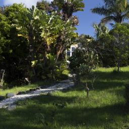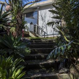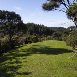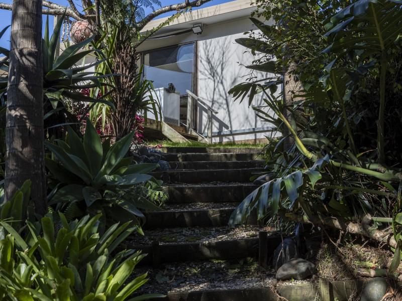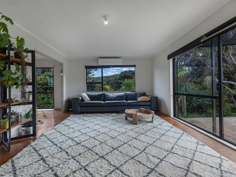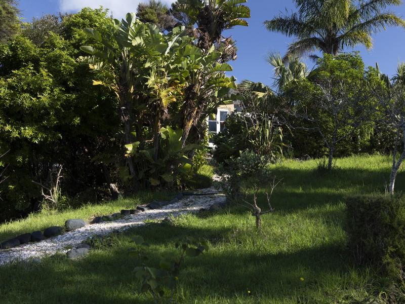 The re-located home (fully consented) nestles amongst landscaped gardens and paths with fruit trees, exotic decorative plants and trees, and beautiful native bush on an elevated knoll that gets plenty of sun and is sheltered and very private.