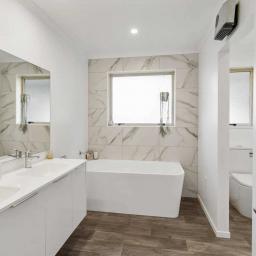 New luxury bathroom includes his and hers vanity with a fantastic amount of storage space, splash to your heart's content in the deep bath, electric wall heater and semi-separate toilet.