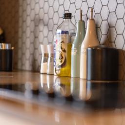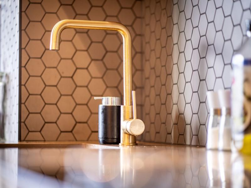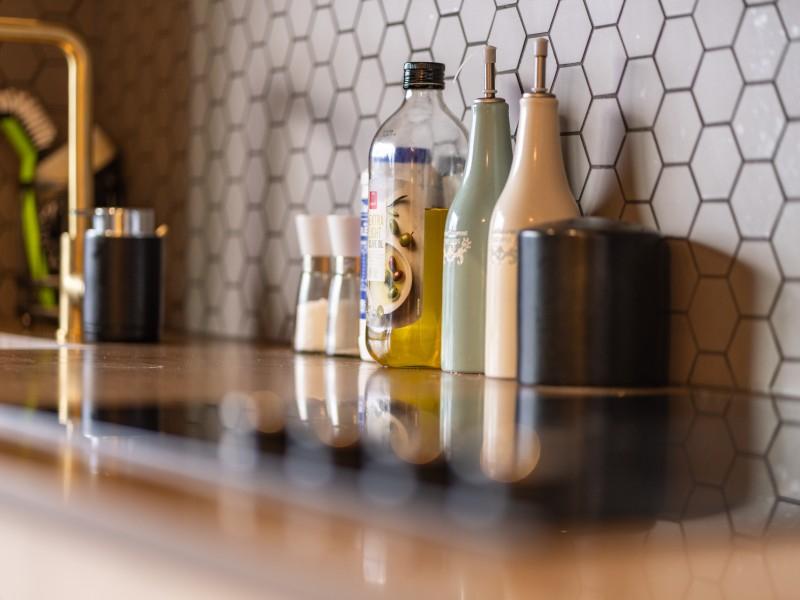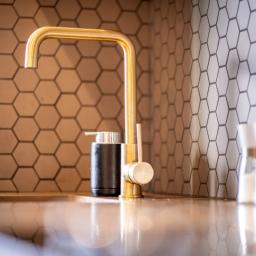 - Designer kitchen with granite benchtop, induction cooktop, integrated appliances, and brass accents
