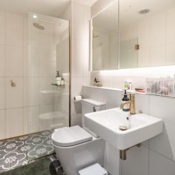 - Moroccan-inspired bathroom with walk-in rainfall shower