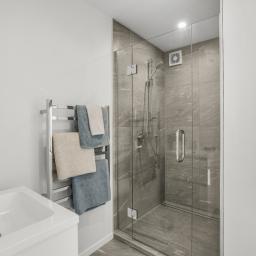 - Stylish bathrooms with tiled showers, wall-hung vanities, and modern fittings