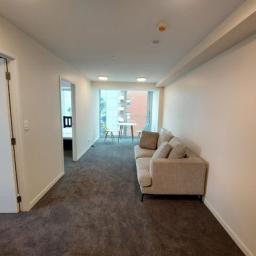 Inside, the apartment offers approximately 44m2 (more or less) of thoughtfully utilised space. Floor-to-ceiling windows in the open-plan living area flood the home with natural light while offering elevated views towards the Harbour Bridge. The compact yet functional layout includes two bedrooms, a central bathroom, and open-plan kitchen and living.