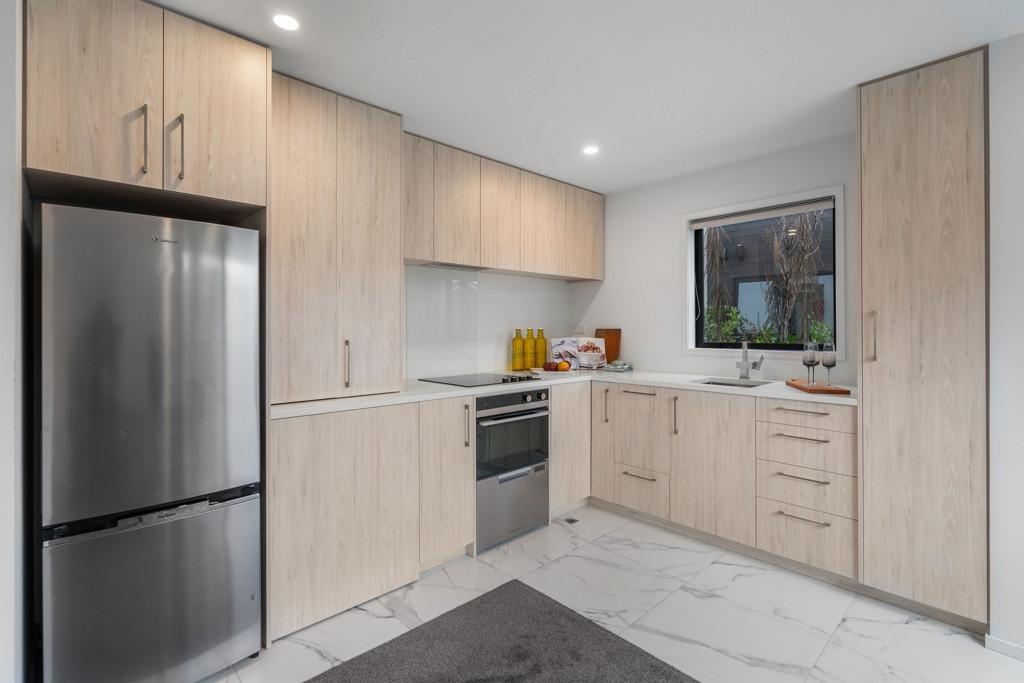 The kitchen is equipped with quality appliances, engineered stone bench-tops and premium tiled flooring, while upstairs are two double bedrooms with built-in wardrobes, the master also with sliding door cupboards, and modern bathroom with tiled flooring. Storage is significant throughout the home.