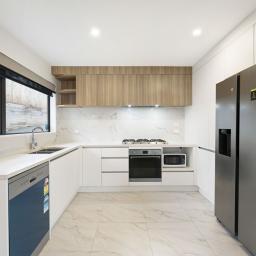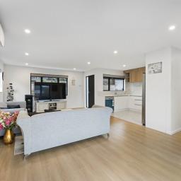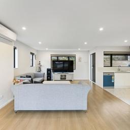 The light-filled open-plan living area flows effortlessly into a sleek, modern kitchen and dining space - ideal for entertaining friends or enjoying relaxed family meals.