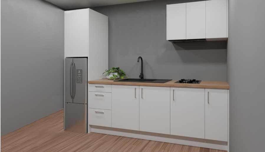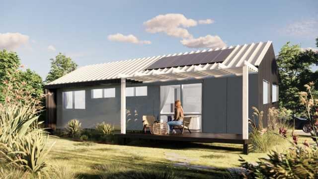 The materials in the current plan are timber framing, grooved shadowclad ply on the end walls, James Hardie ExoTec™ Facade sheets on the long walls, Metalcraft E span 340 roofing, NZ-made thermally broken double glazed aluminium joinery, with the unit placed on groundscrew foundations from stopdigging.co.nz. Internally we normally use pre-finished birch ply with negative detailing, and our kitchen is designed and manufactured by Amorini in Palmerston North.