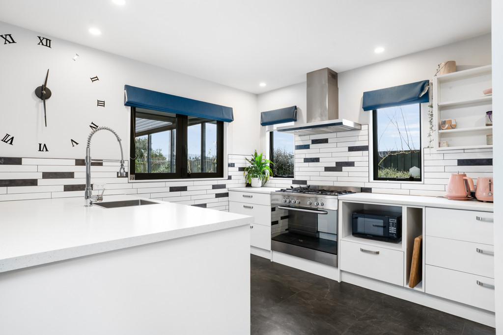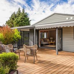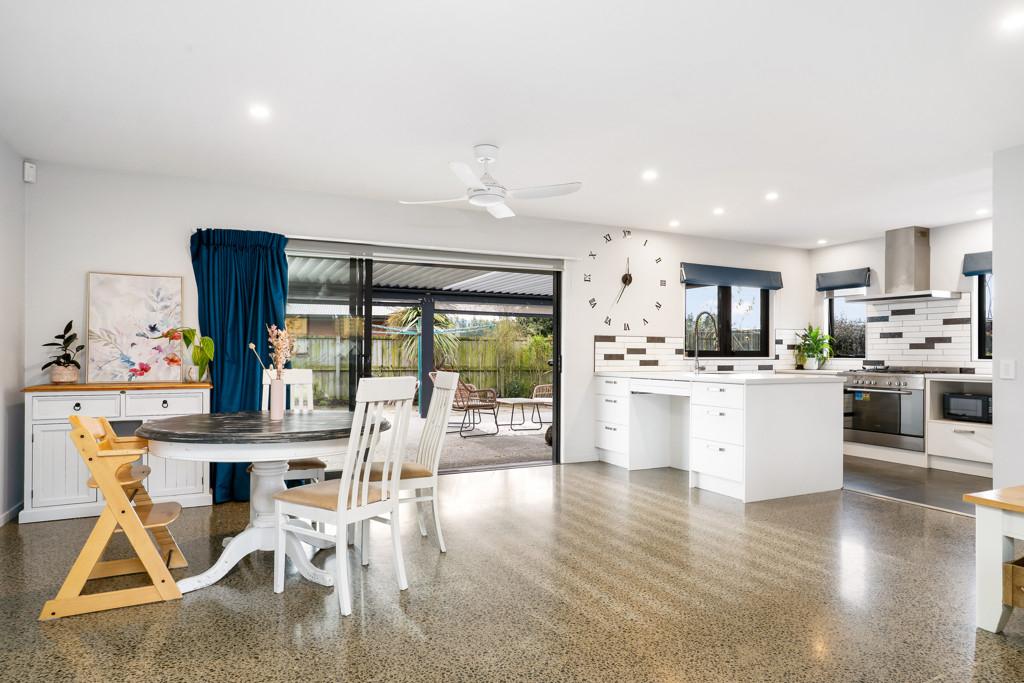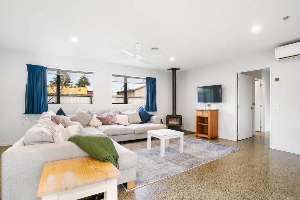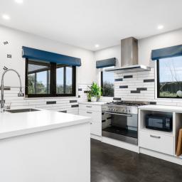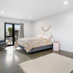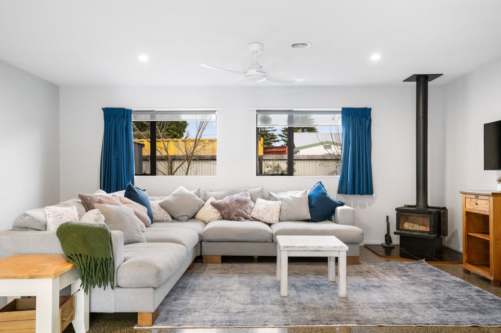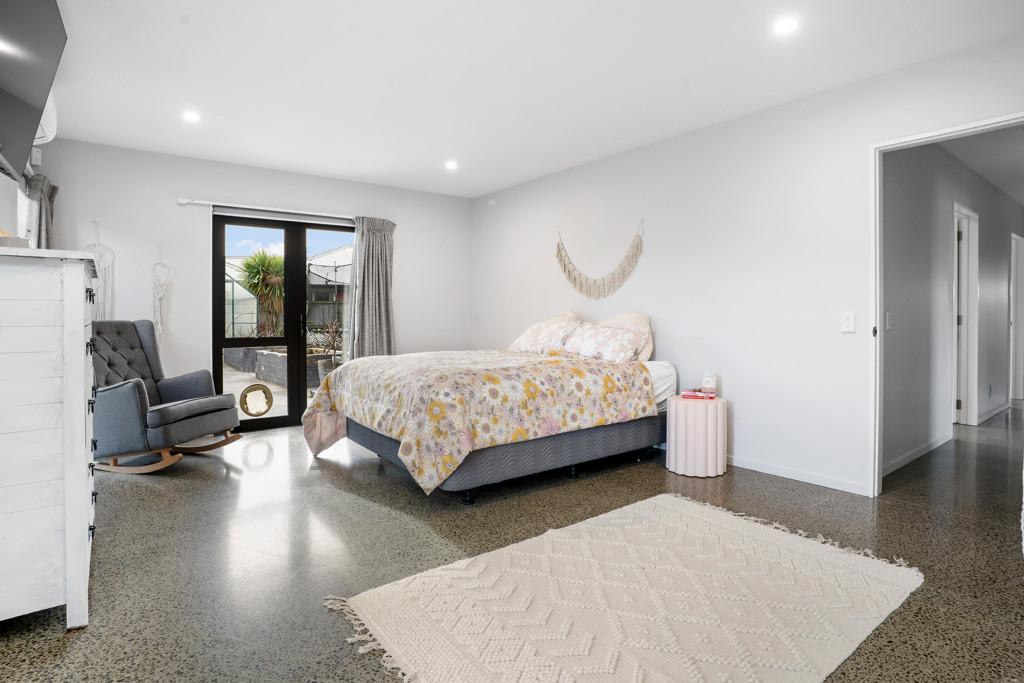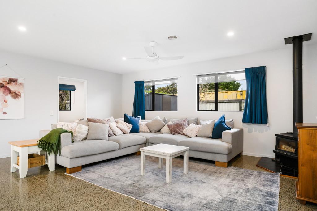 The heart of the home is the expansive open-plan kitchen, dining, and living space that flows seamlessly to a louvred outdoor entertaining area - your ultimate all-season Al Fresco lounge. Polished exposed aggregate concrete floors with underfloor heating, a wood-burner with heat transfer, two heat pumps, and full insulation with double glazing mean you'll be cosy in winter and cool in summer.