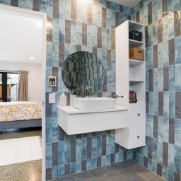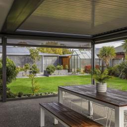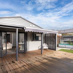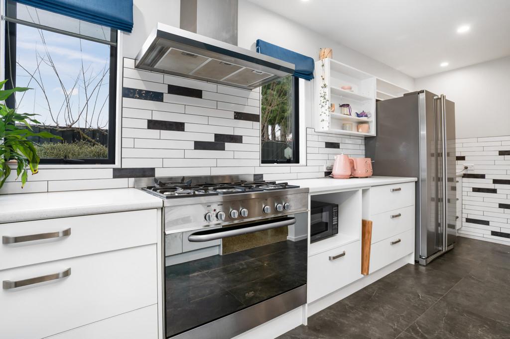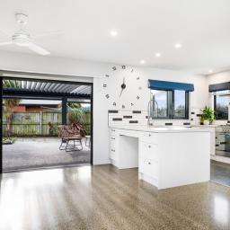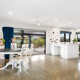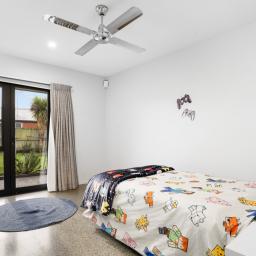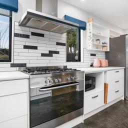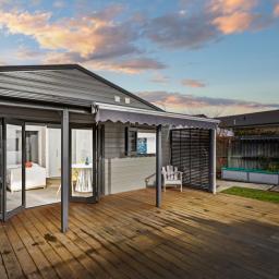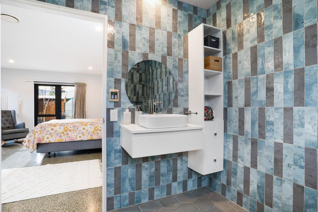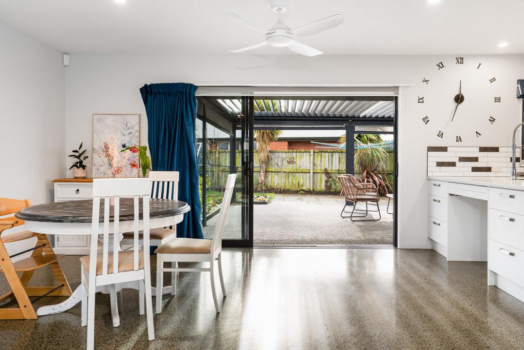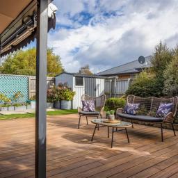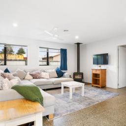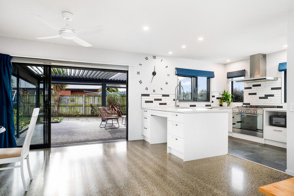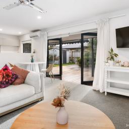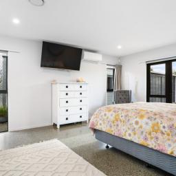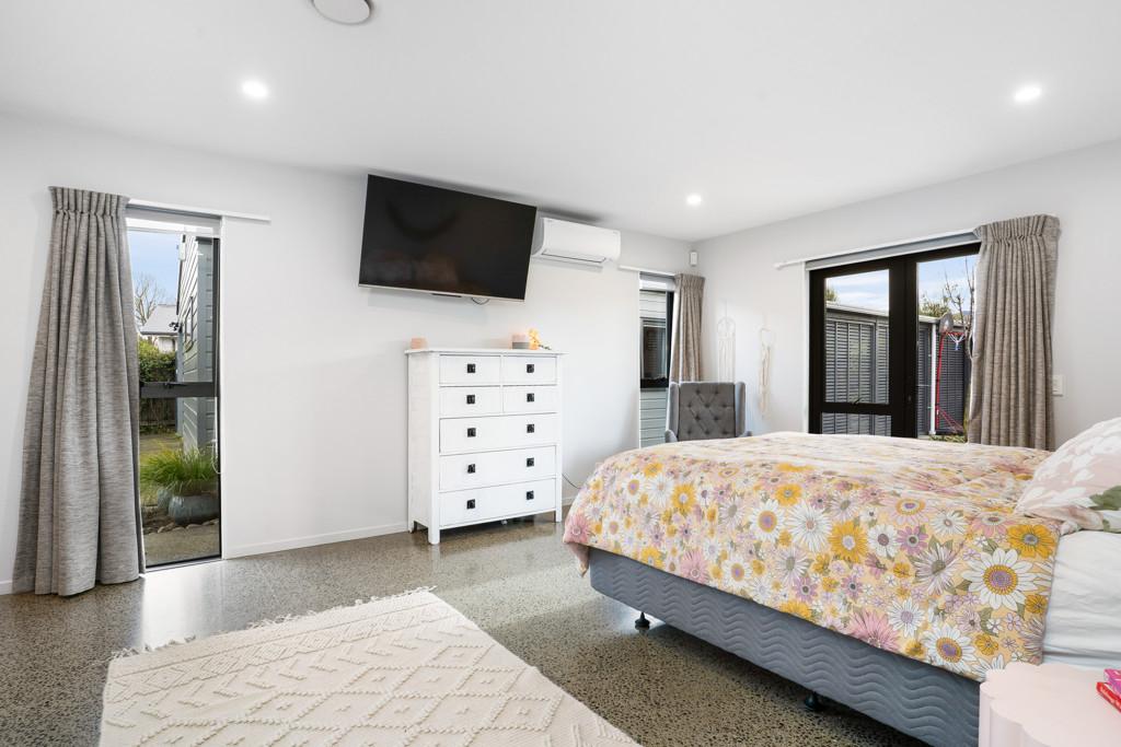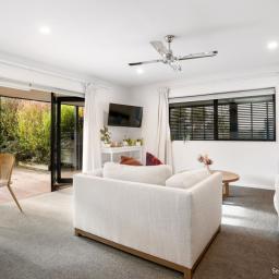 The heart of the home is the expansive open-plan kitchen, dining, and living space that flows seamlessly to a louvred outdoor entertaining area - your ultimate all-season Al Fresco lounge. Polished exposed aggregate concrete floors with underfloor heating, a wood-burner with heat transfer, two heat pumps, and full insulation with double glazing mean you'll be cosy in winter and cool in summer.