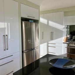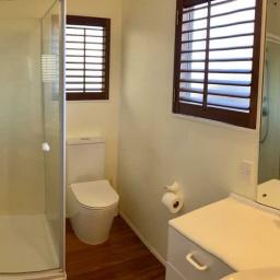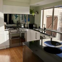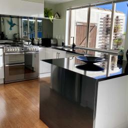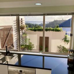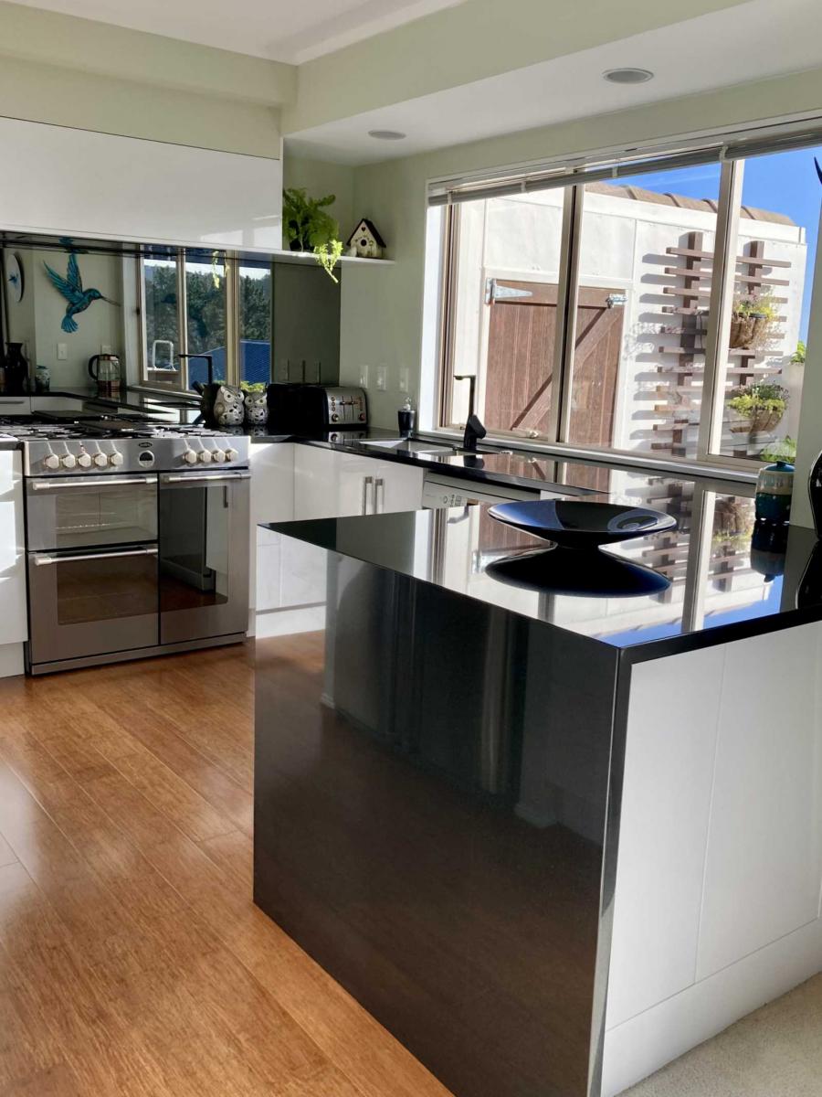 You’ll love the new kitchen… bamboo flooring, gorgeous granite benches, large mirrored splash-back, concealed range-hood, double sinks, soft-closing cupboards and drawers and three pantries make cooking a breeze and all with a sea view too. The kitchen window is a sliding serve-over to the pretty harbour deck. A fabulous five-burner Belling gas range with electric grill and two electric ovens, sink waste disposal, and Bosch SuperSilence dishwasher are the icing on the cake!