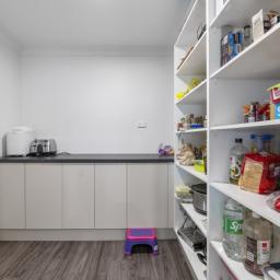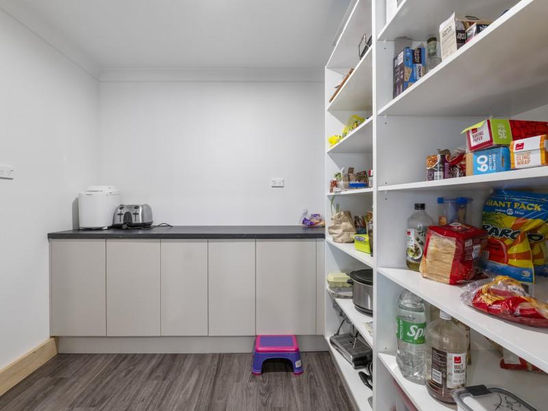 At the heart of the home is a beautifully appointed family kitchen. An oversized stone island anchors the space, complemented by a full-length stone benchtop with integrated sink, a servery window, and a walk-in pantry framed by a stylish barn door. It’s a kitchen made for gathering, cooking, and enjoying life’s everyday moments.