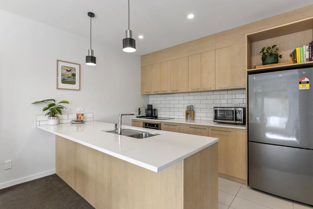 • A Scandi-inspired kitchen featuring sleek stone benchtops, subway tile splashback, induction hob, and handy in-bench seating-both stylish and functional.
