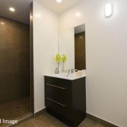 The bathroom is roomy and tiled, with a separate laundry cupboard.
