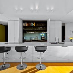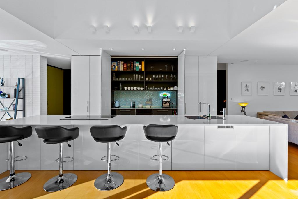 The bespoke kitchen, customised with quality appliances, sleek cabinetry and a central island, is perfectly positioned for hosting everything from dinner parties to casual drinks with family and friends.