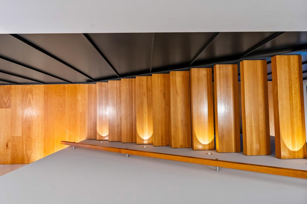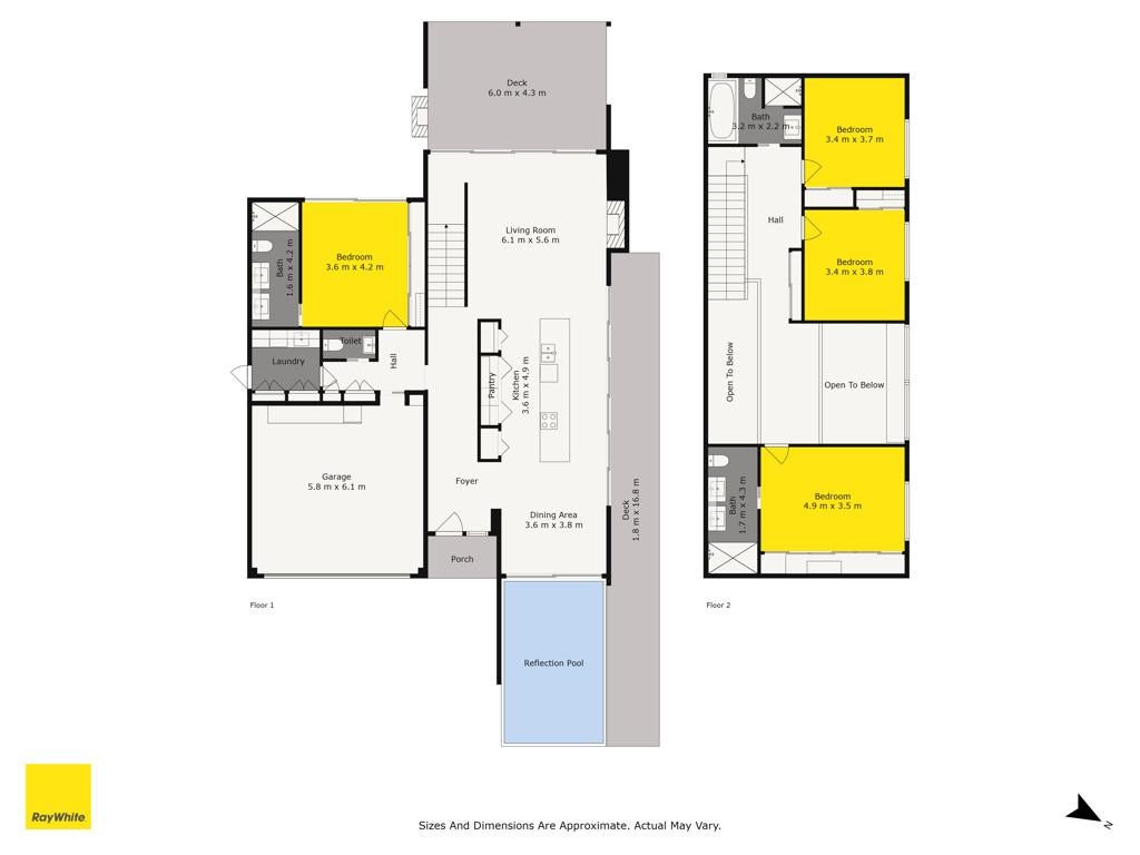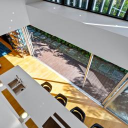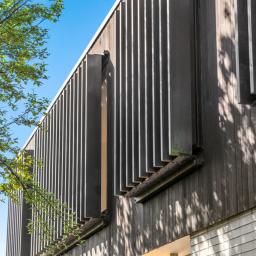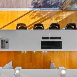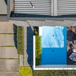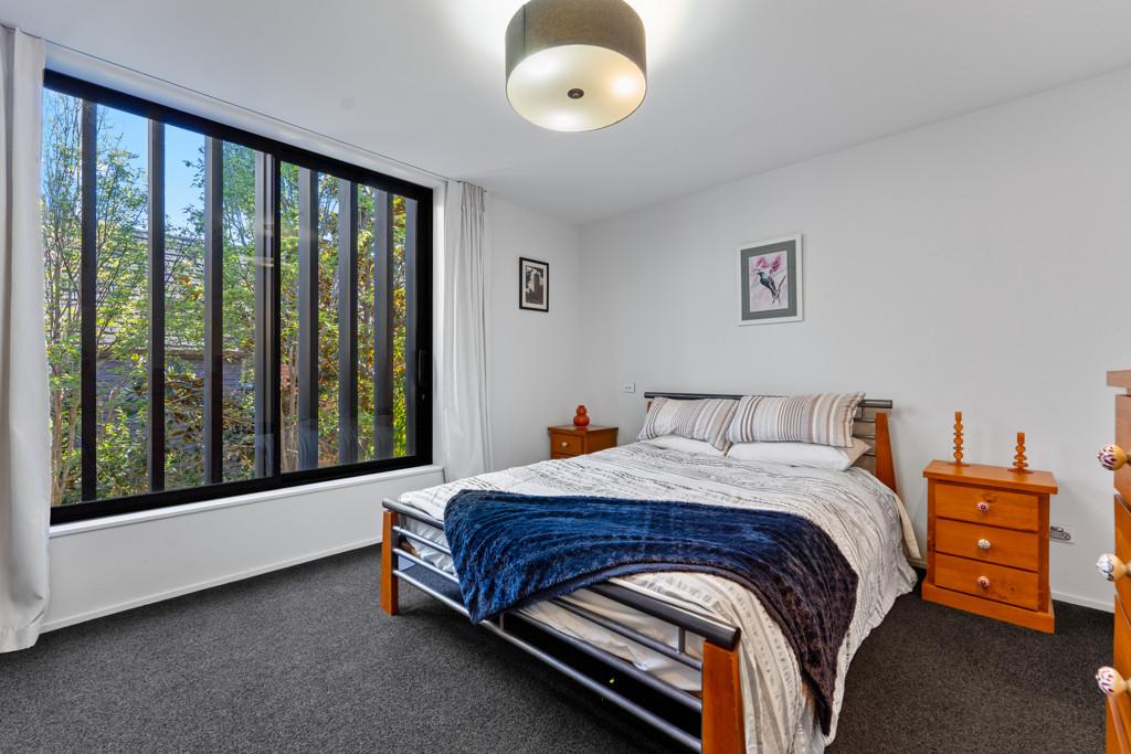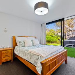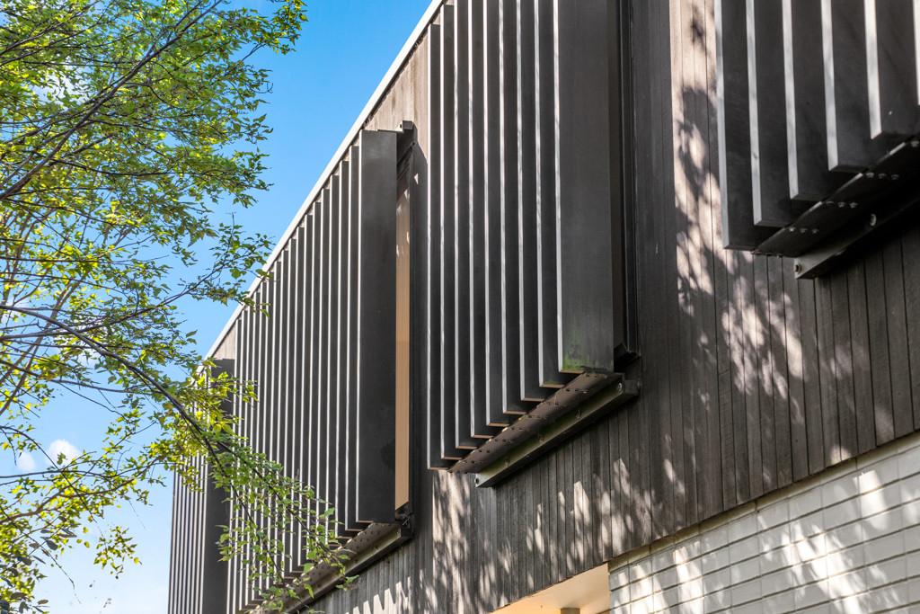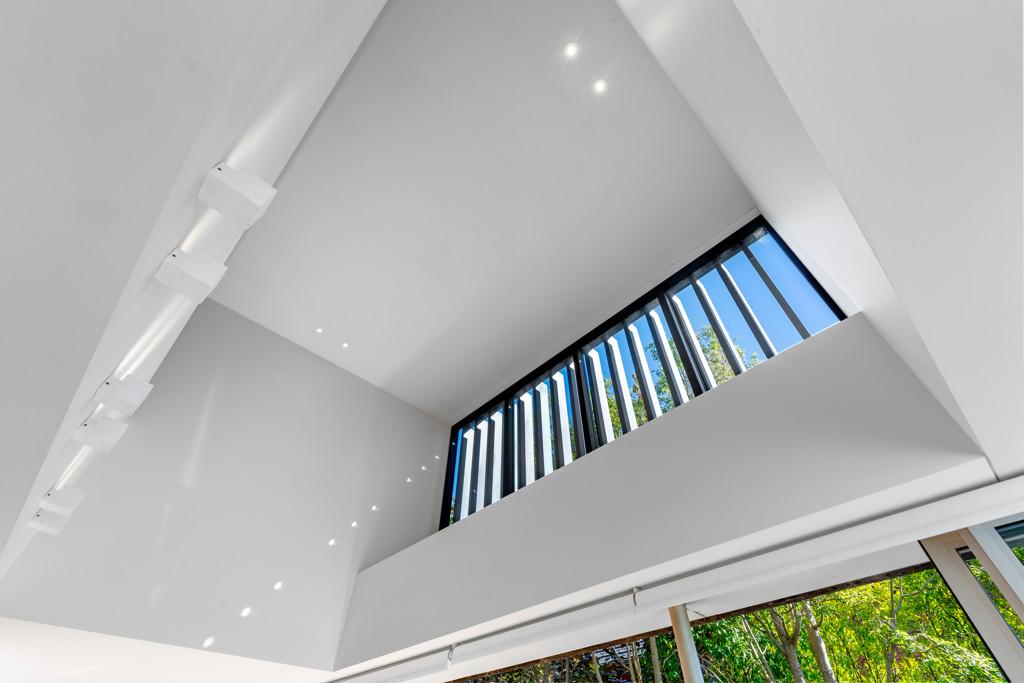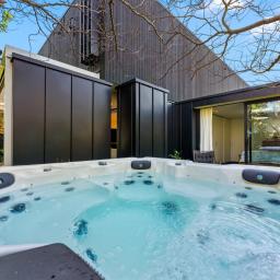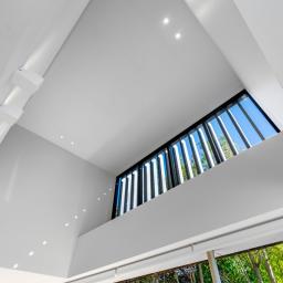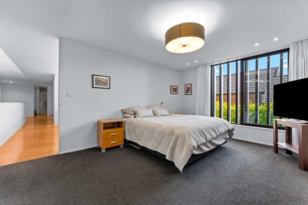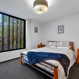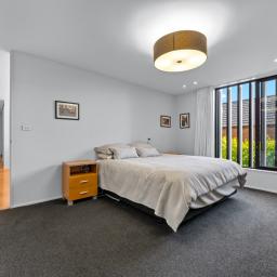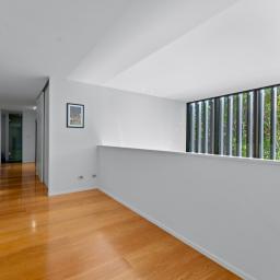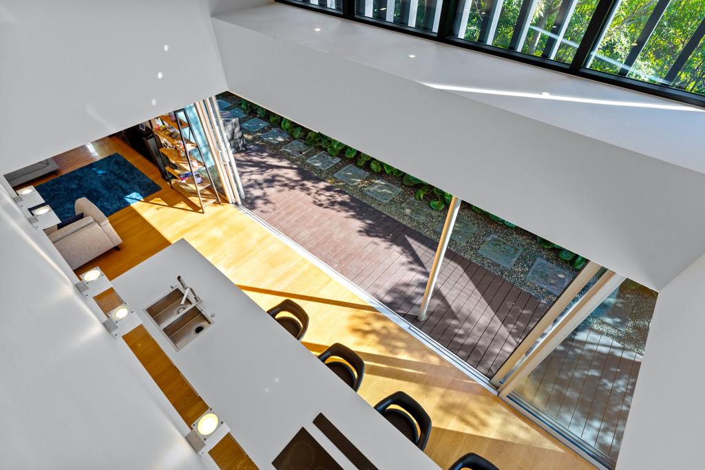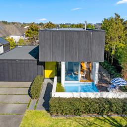 The ground floor flows as a light-filled conservatory-style living zone, opening seamlessly to landscaped outdoor spaces. Above, a dramatic suspended cedar box houses the three main bedrooms, while a sleek black Colorsteel pavilion secures the garage, guest quarters and service areas.