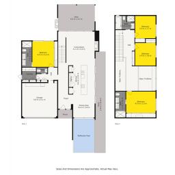 Generously configured, the home offers two luxurious master suites (one on each level), plus two additional bedrooms, a family bathroom and powder room. Expansive sliding doors connect the interior to beautifully landscaped grounds featuring a reflection pool, indoor and outdoor fireplaces, alfresco entertaining spaces and an outdoor spa area.