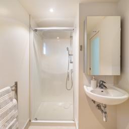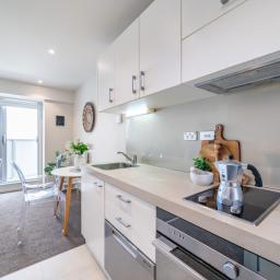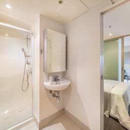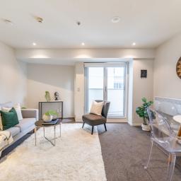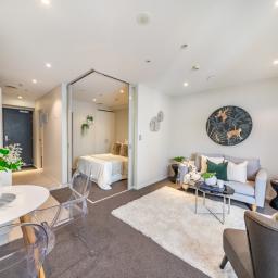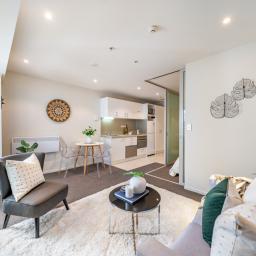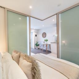 The apartment features a separate bedroom with a semi-ensuite bathroom, offering both privacy and convenience. The clever layout makes excellent use of space, while large windows ensure plenty of natural light throughout.