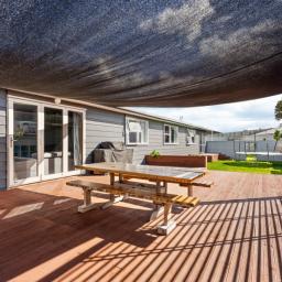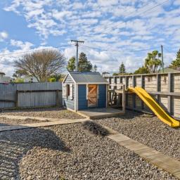 Outdoors is where this property really stretches its legs. A huge sheltered deck — privacy screened and bathed in sun — runs off the lounge, creating the perfect year-round living space. Kids and pets will love the fully fenced section with secure gate, complete with a playhouse and lawns to run about. The roof and exterior have been freshly painted, so the hard work is already done. Shed-wise, you’re spoilt: a single garage with workshop space, a serious tandem carport, and plenty of room for tools or tinkering projects.