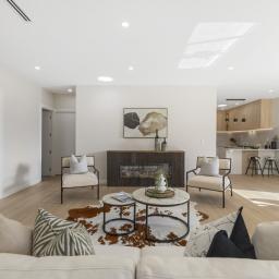 At the heart of the home lies a beautifully designed kitchen with quality finishes, complemented by open-plan living and dining that flow seamlessly to the expansive deck. High ceilings and skylights flood the interiors with natural light, while a cosy fireplace ensures warmth and comfort through the cooler months.