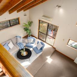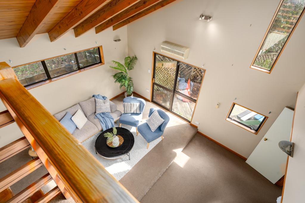 On the lower level you have a clever floor plan giving you two connected living spaces, open plan kitchen, master bedroom with semi ensuite, another double bedroom, family bathroom as well as space for a home office. Upstairs is one more bedroom, perfect for teenagers wanting their own space. There is good indoor/outdoor to a private deck and garden area and the lower level offers a double internal access garage with added storage space.