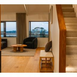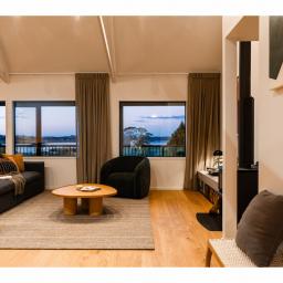 • Spacious open-plan living area with high vaulted ceilings and premium water views