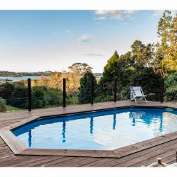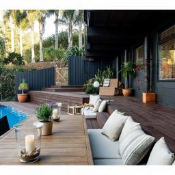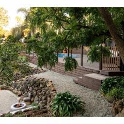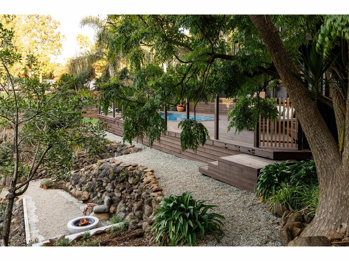 • Outdoor entertaining areas including a firepit, swimming pool, expansive decks for dining.
