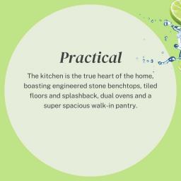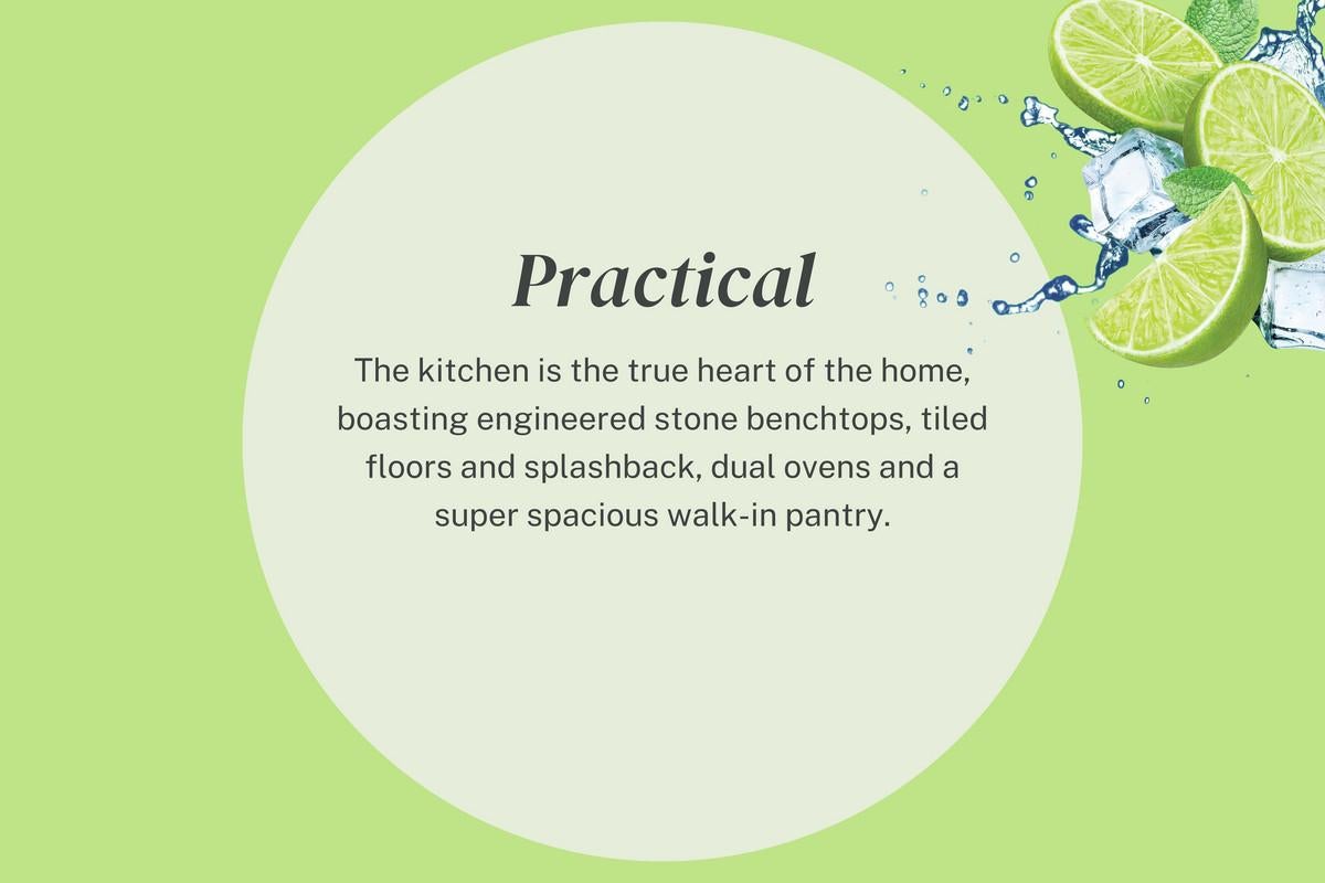 DELICIOUSLY PRACTICAL KITCHEN: The kitchen is the true heart of the home, boasting engineered stone benchtops, tiled floors and splashback, dual ovens and a super spacious walk-in pantry. The island breakfast bar creates a natural gathering spot for busy mornings or casual evenings.