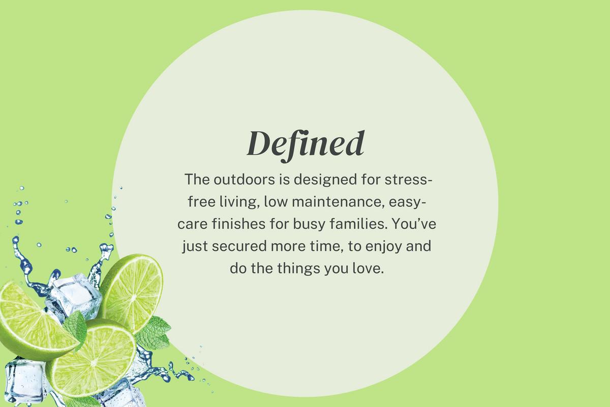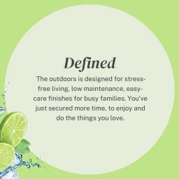 DEFINED: The outdoors is designed for stress-free living, low maintenance, easy-care finishes for busy families. You've just secured more time, to enjoy and do the things you love.