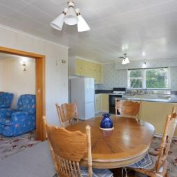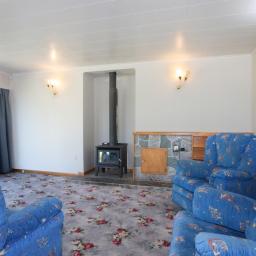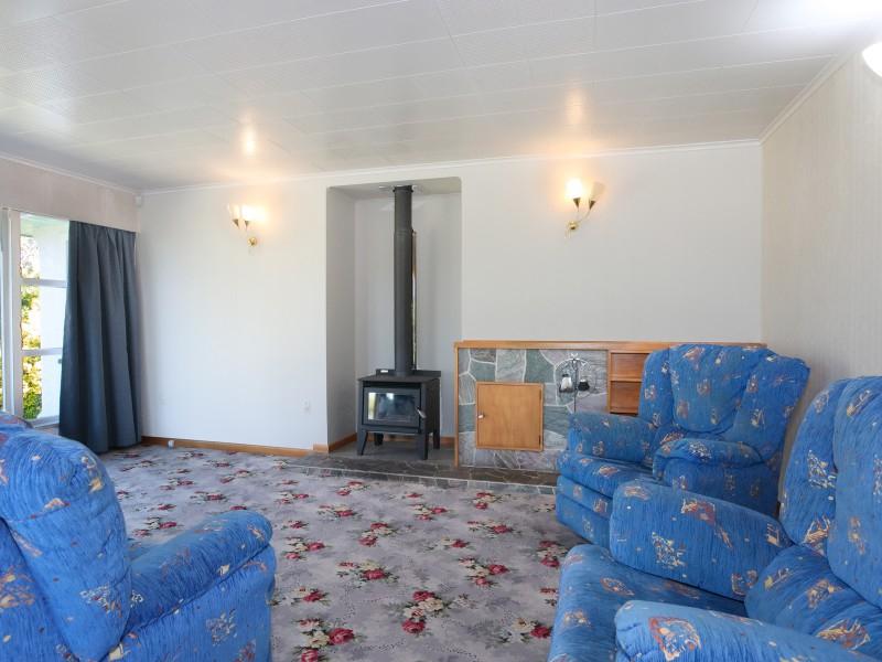 The north-facing open-plan kitchen and dining area flows through to a spacious lounge, with sliding doors allowing the space to be opened up or closed off as needed. A log fire installed in 2020 provides efficient heating, while French doors open from the lounge to a covered patio — ideal for indoor-outdoor living.