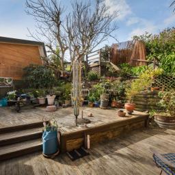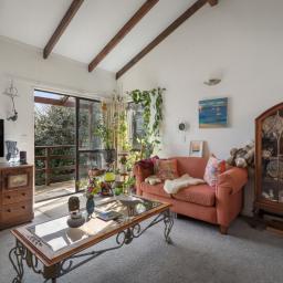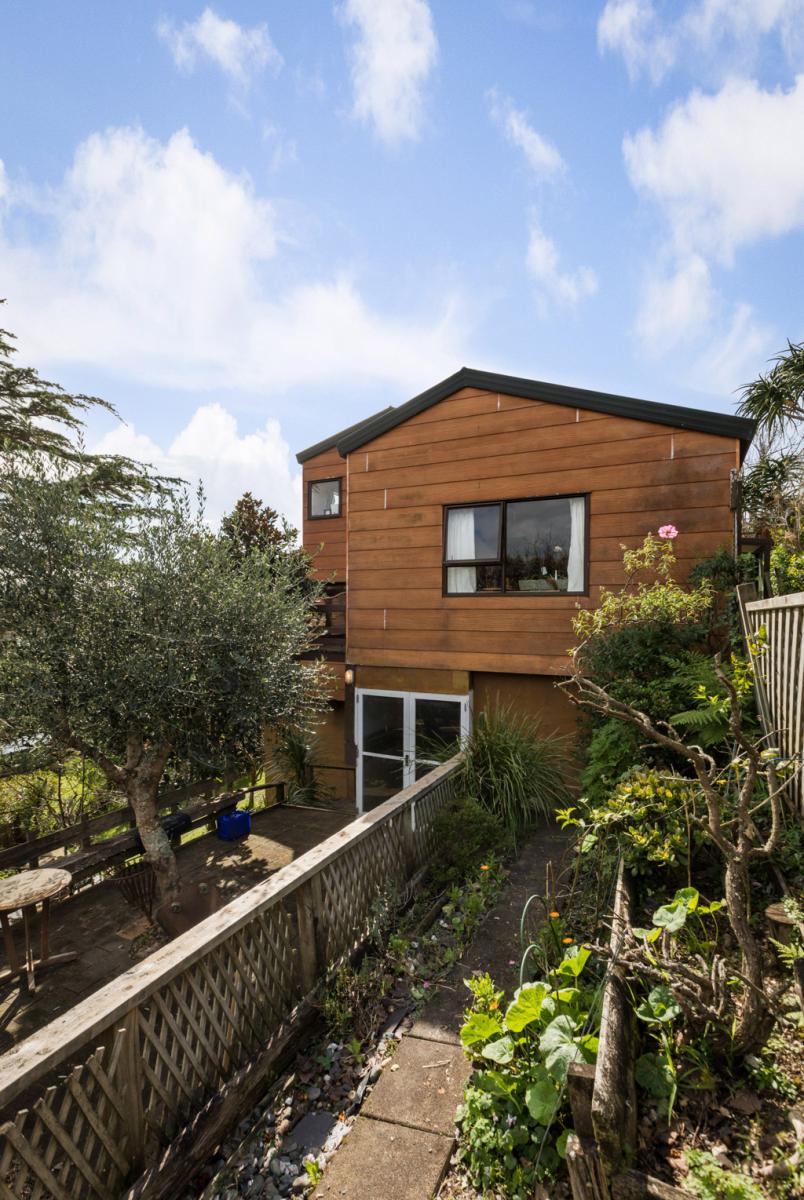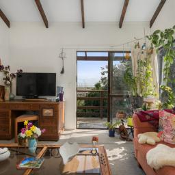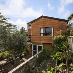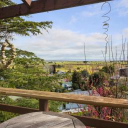 The master suite includes an ensuite and double wardrobe, while two further double bedrooms also enjoy elevated outlooks. The galley-style kitchen flows into open-plan dining and living, with a cosy lounge opening to a balcony where you can soak in the scenery. A second sitting area offers flexibility, opening to another deck with steps leading down to the terraced gardens and raised vege beds.