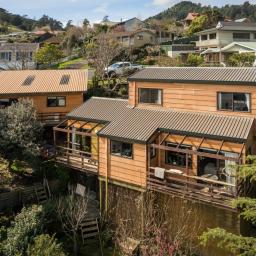 Positioned above the Firth in a peaceful cul-de-sac, this split-level pole home offers a unique blend of character, comfort, and incredible views. Spread across three short levels, the home feels like a modern treehouse, with every angle designed to capture the water and changing light.