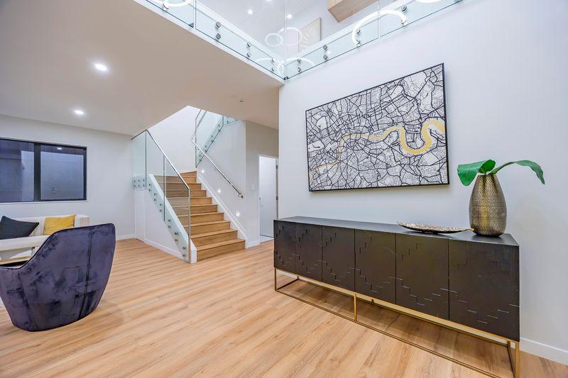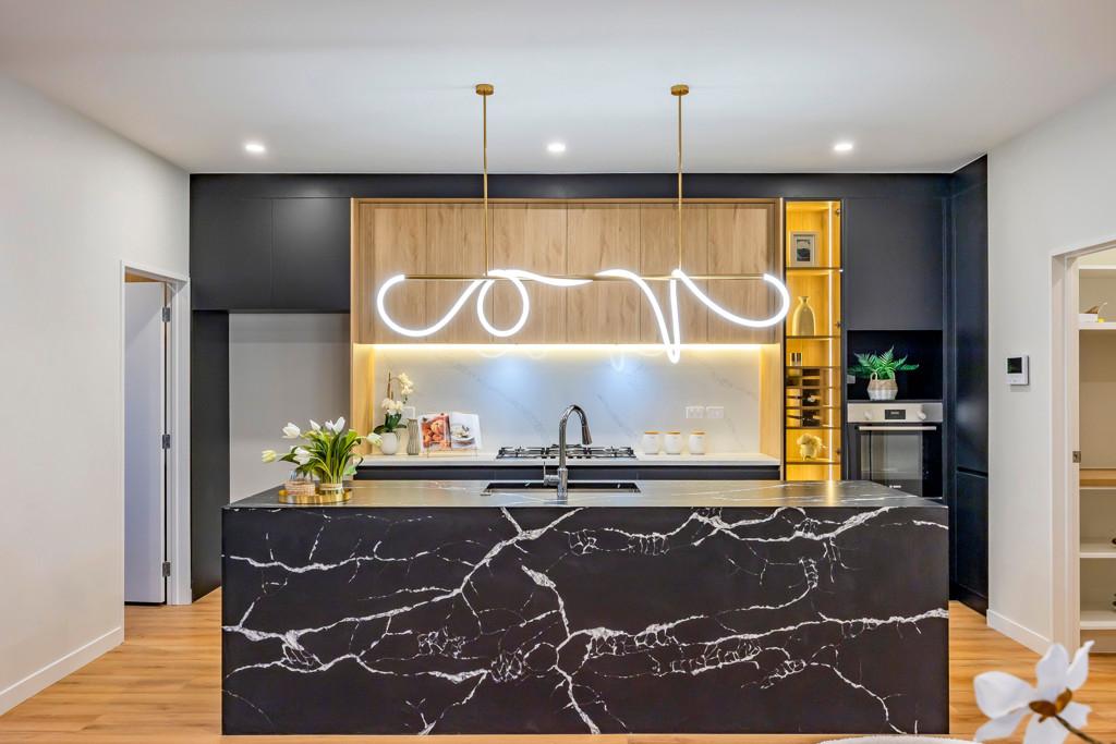 The designer kitchen with an island bench and butler's kitchen is a chef's dream, flowing seamlessly into the open-plan living and dining areas and a spacious deck for effortless entertaining.